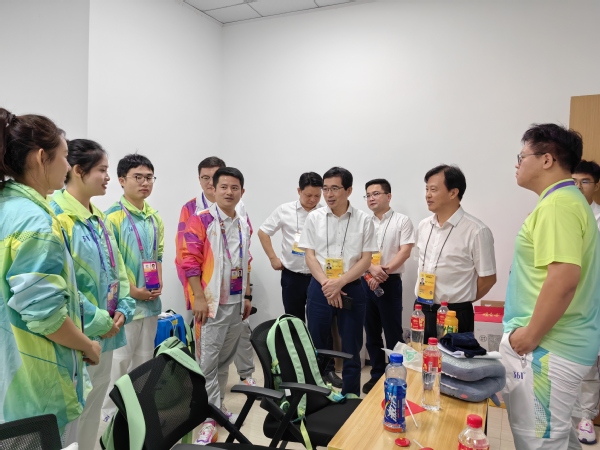 上午9点多,校党委书记钱天国、校长陈光亭来到萧山瓜沥文体中心,看望慰问正在参与亚运志愿服务的水院“小青荷”们。萧山区政协党组副书记、副主席、场馆常务副指挥长童一峰,瓜沥镇镇长、场馆秘书长顾欢军等陪同走访慰问,学校办公室、团委负责人参加慰问活动。