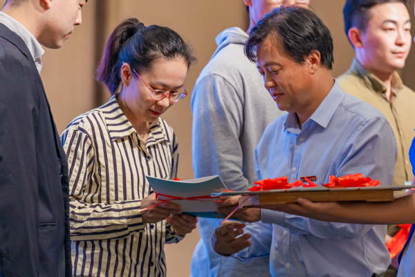 陈光亭为新进教职工代表发放水院优秀教师教书育人故事集《师说》。
