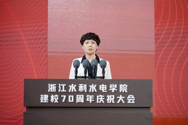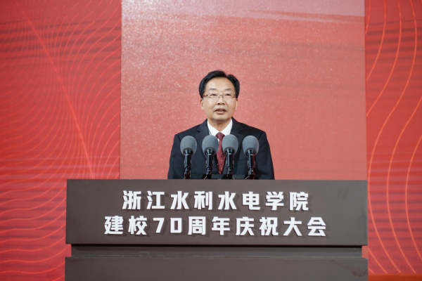 王静宣读水利部贺信。贺信指出,浙江水利水电学院全面贯彻党的教育方针,落实立德树人根本任务,为社会培养输送了一大批高素质应用型人才,办学质量、办学效益及社会声誉逐年提升,特别是学校自水利部与浙江省人民政府共建以来,水利学科实力不断增强,水利特色更加鲜明,为水利事业发展作出了重要贡献。新征程上,希望学校坚持以习近平新时代中国特色社会主义思想为指导,全面贯彻科教兴国战略、人才强国战略,坚守“为党育人、为国育才”初心使命,聚焦水利事业发展需要,守正创新,全面提升办学水平,在水利人才培养、科学研究、社会服务等方面不断取得新成绩,为推动新阶段水利高质量发展作出新的更大贡献。