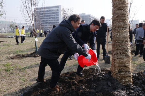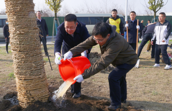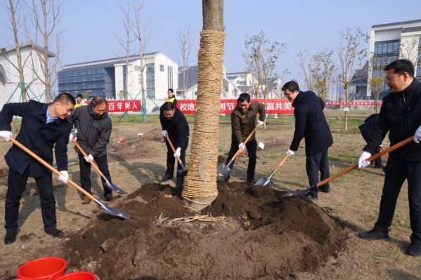 3月8日上午,阳光温暖、微风和煦,南浔校区南门附近,草木萌发,生机勃勃,校党委书记钱天国,校长万健与区委书记温建飞,区委副书记、区长程佳,区人大常委会党组书记、主任陆卫良,区委副书记、社工部部长、政法委书记张文斌等领导,在“3·12植树节”即将来临之际,带头参加义务植树活动,一起为新植的树木培土浇水,共同种下这友谊、合作、共进之树。活动现场,参与植树的校领导与南浔区四套班子领导们挥锹、扶苗、铲土、浇水……相互配合,紧张有序,为学校增添一片新绿。